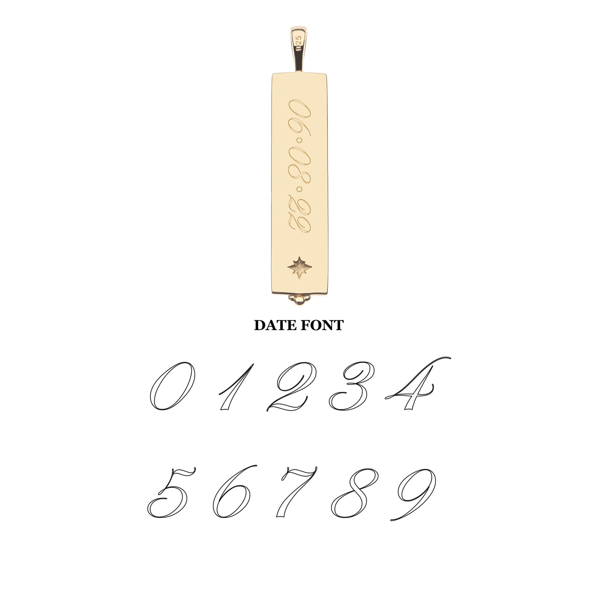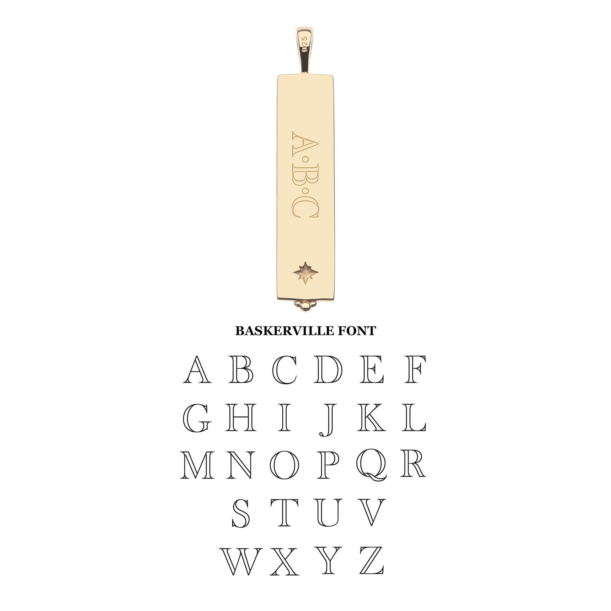 Personalize this pendant by selecting three letters or a date to engrave! For the initials, we offer the Baskerville Font, and for the date we offer a Script font. A delicate dot separates the letters and date.
