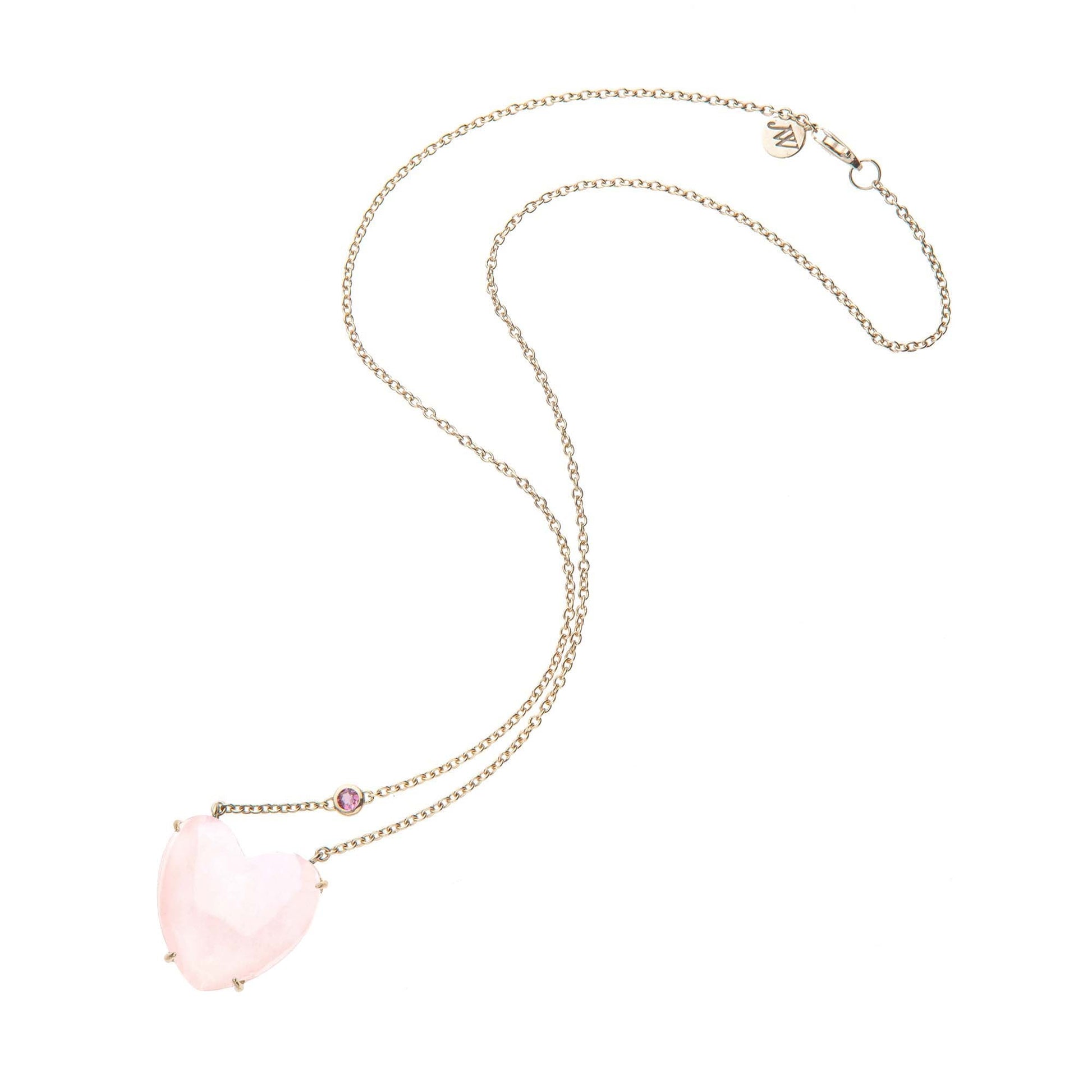 Statement carved rose quartz heart pendant set in 10k gold and accented with pink tourmaline detail.