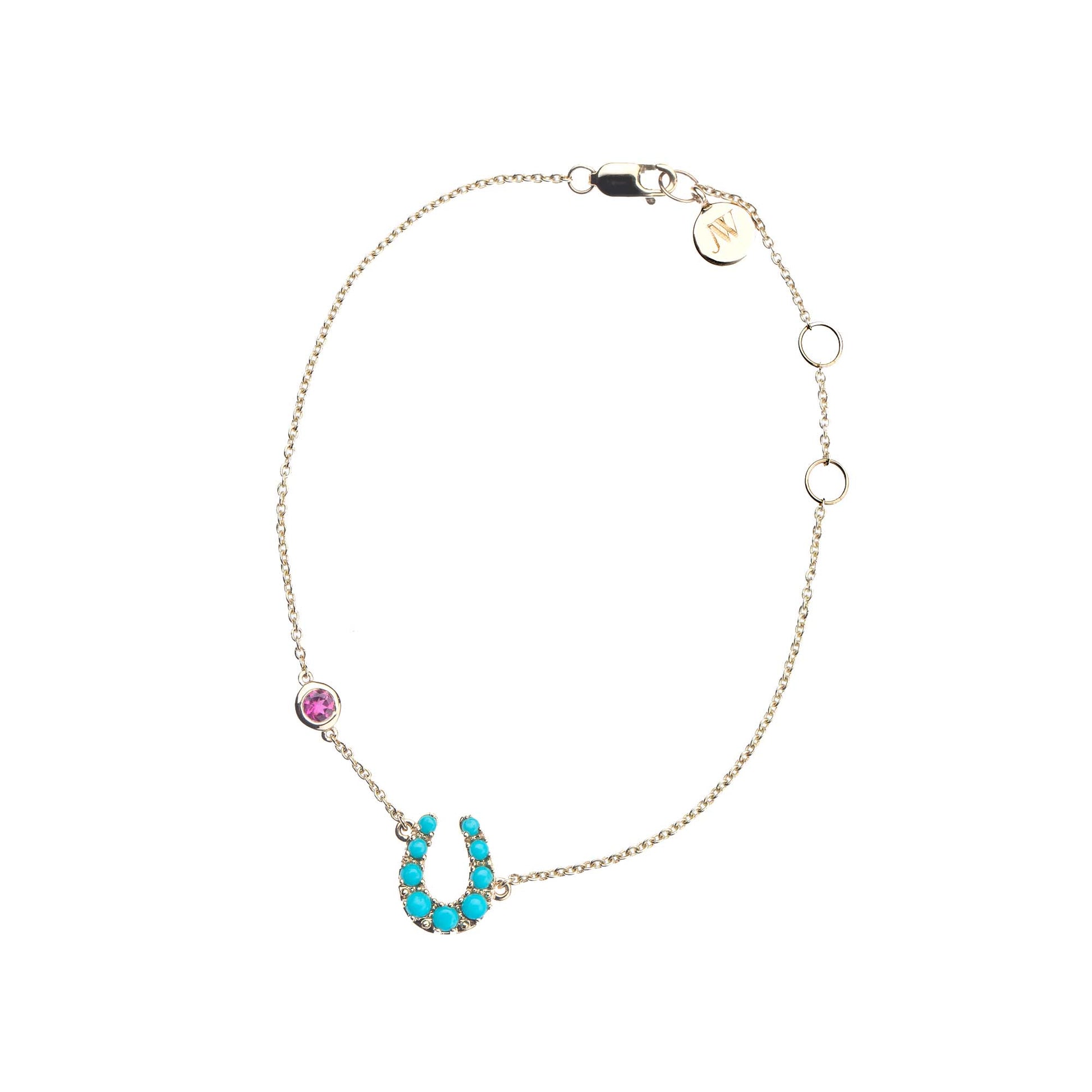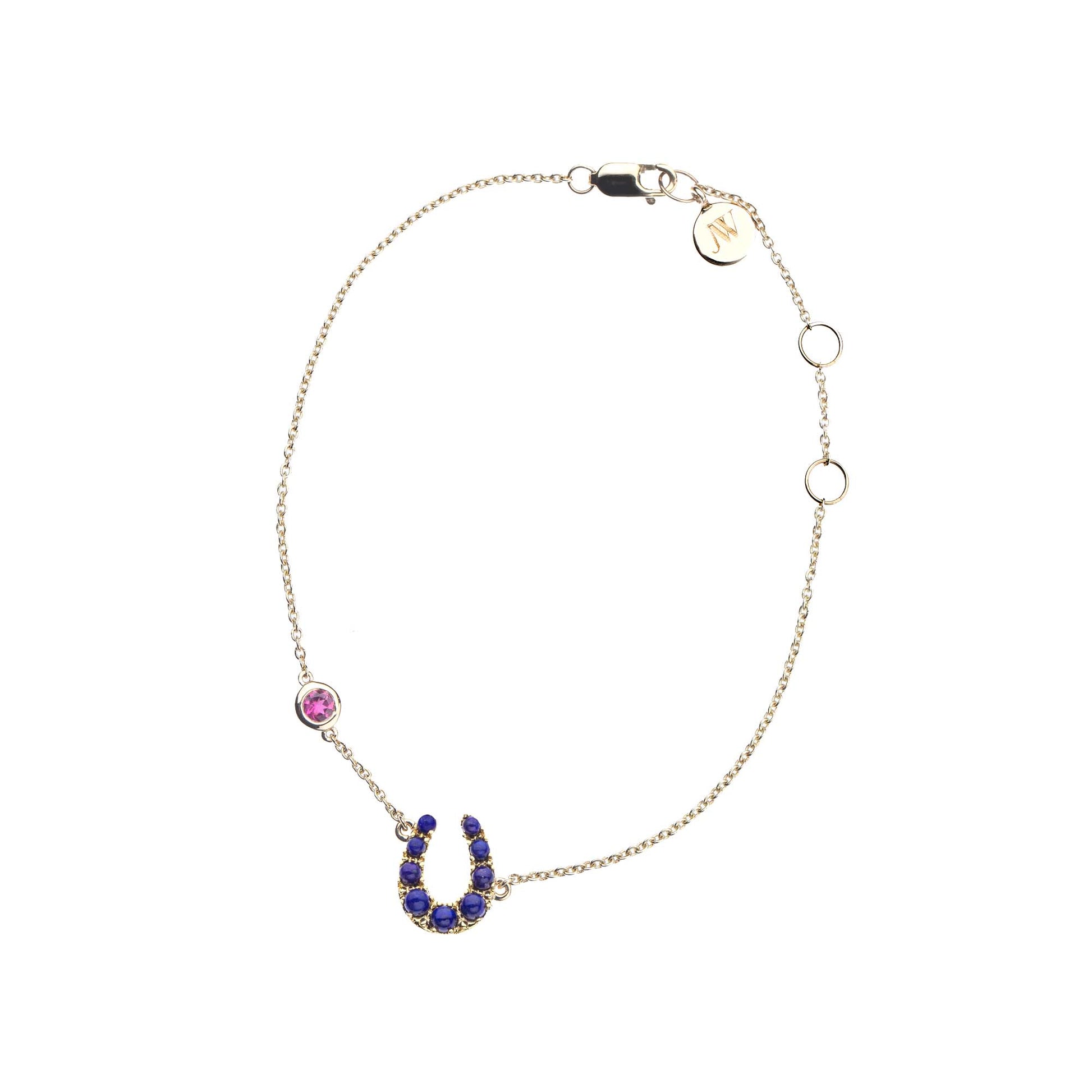 A little bit of lucky with a little pop of color, this baby horseshoe is crafted from 10k gold, set with hand-carved cabochon stones, and accented with the inscription "LUCKY" on the back side. Set onto a delicate 10k adjustable chain and accented with a pink tourmaline stone.