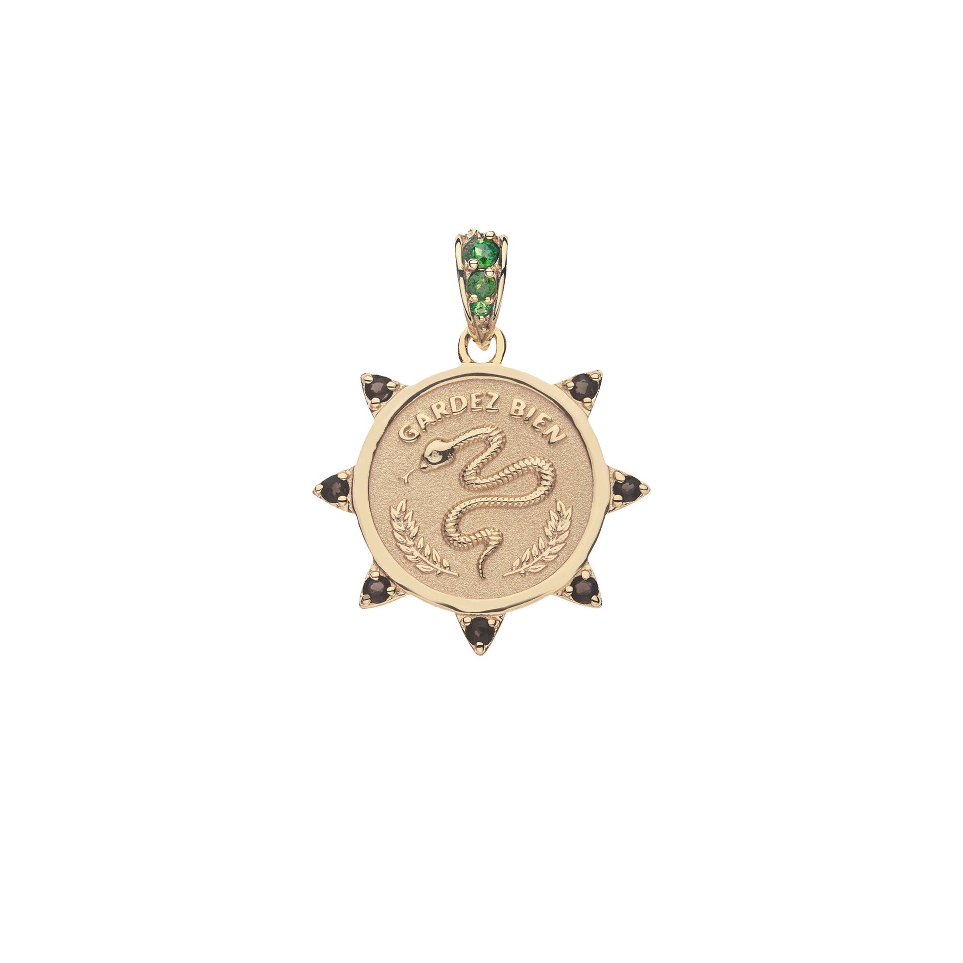 Keep safe. The snake in this pendant symbolizes wisdom, power and healing. Gardez Bien inscribed over the snake is French for Guard Well. This pendant is a reminder of your own strength and the positive ways you protect yourself and those you love.