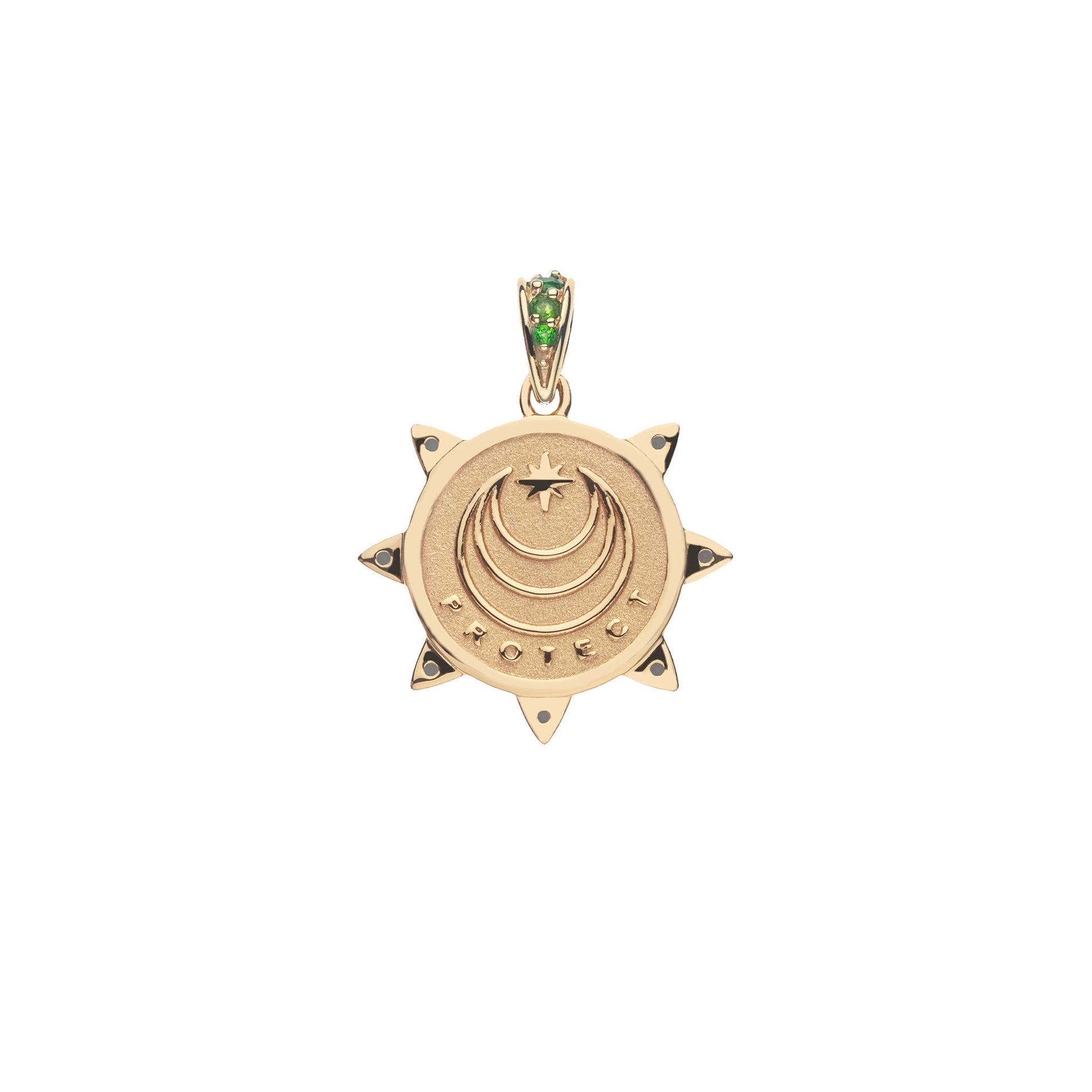 This is a limited edition version of our Original Protect Coin, made in a smaller size and accented with Emerald and Smoky Topaz Stones.