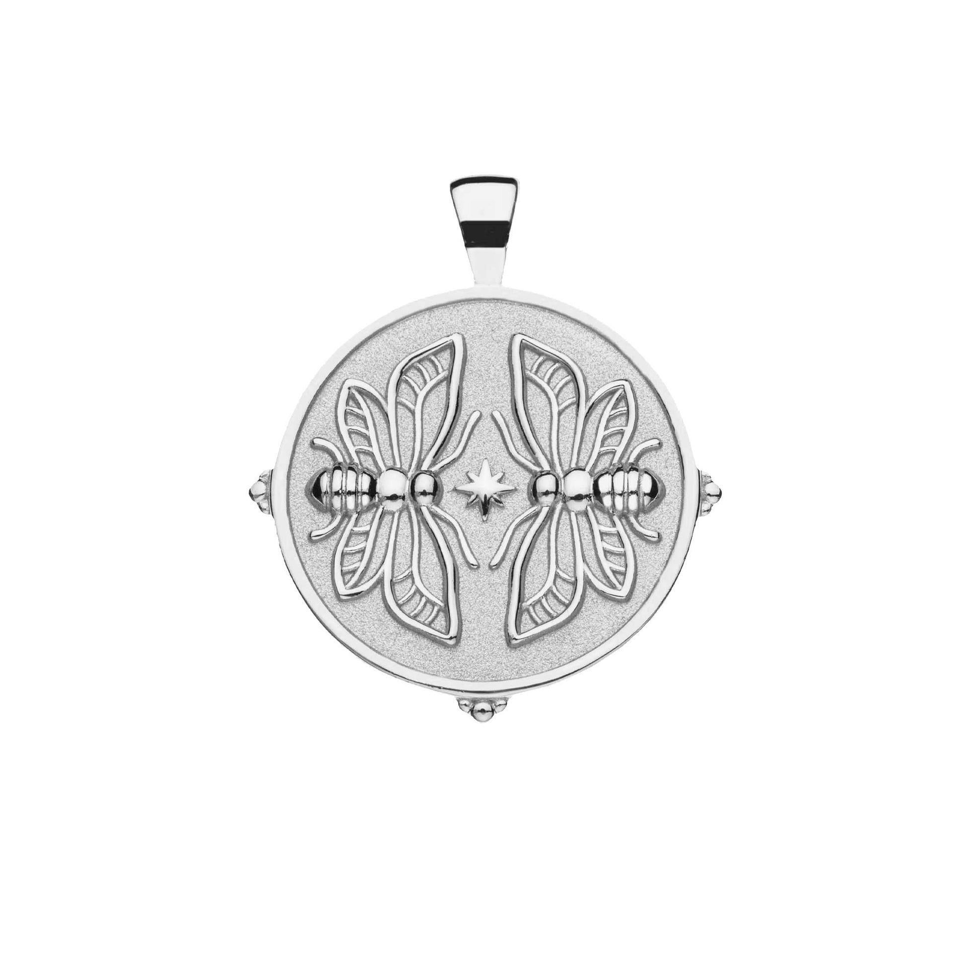 • Coin pendant made of Sterling Silver plated in Rhodium, measuring 1.2" in diameter.