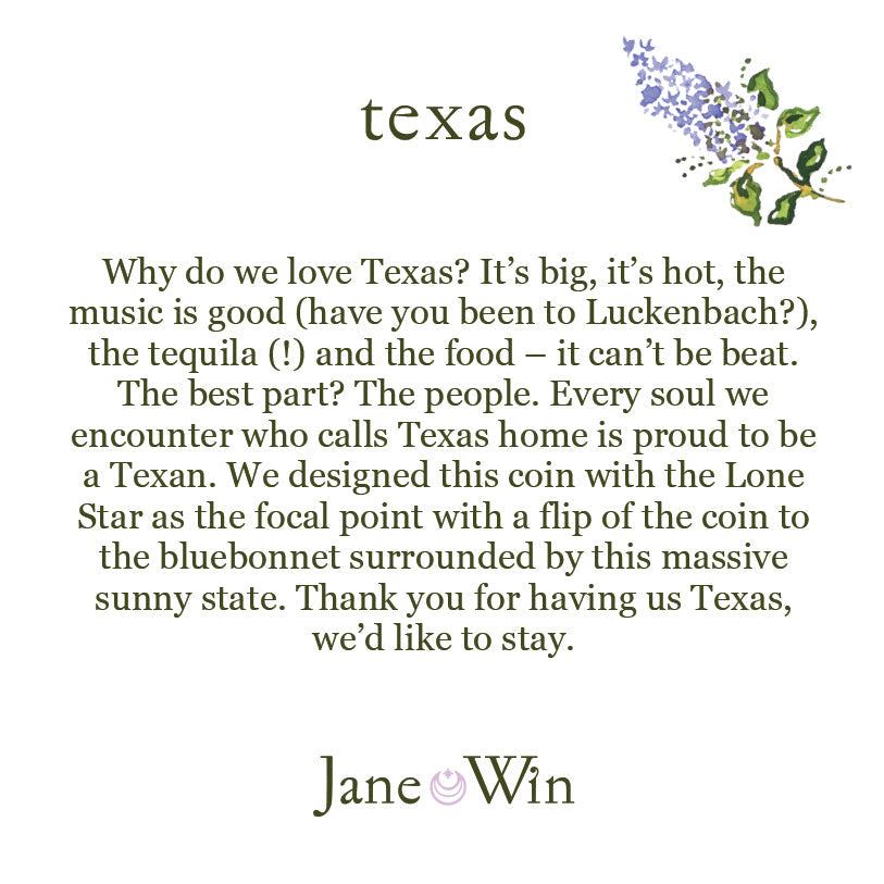 Why do we love Texas? It’s big, it’s hot, the music is good (have you been to Luckenbach?), the tequila (!) and the food – it can’t be beat. The best part? The people. Every soul we encounter who calls Texas home is proud to be a Texan. We designed this coin with the Lonestar as the focal point with a flip of the coin to the bluebonnet surrounded by this massive sunny state. Thank you for having us Texas, we’d like to stay.